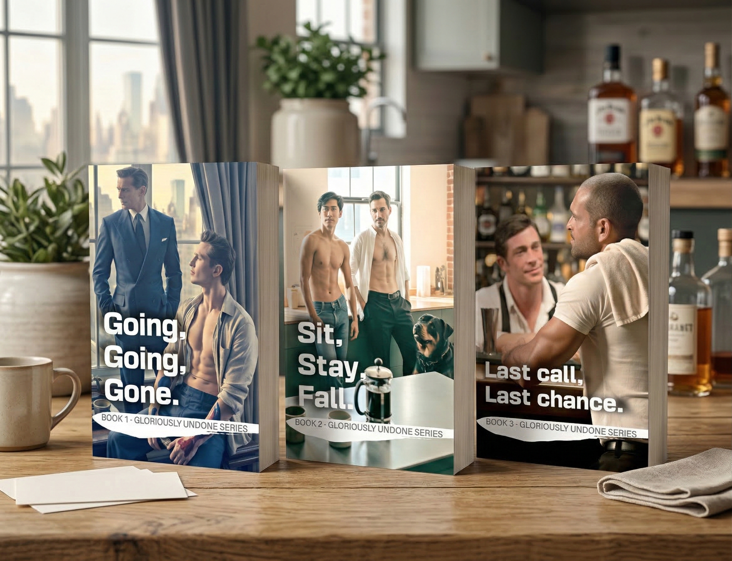 The Pour Decision is a Manhattan bar with regulars who function as found family, a group chat that misses nothing, and a habit of hosting love stories its principals are always the last to recognise. Three books. Three slow burns. A queer artist who outbids his own better judgment. An architect who knows load-bearing structures when he sees them. And the bar’s owner himself, nine years into a rule he made after Garrett—right up until the moment someone arrives and makes the rule impossible to keep.