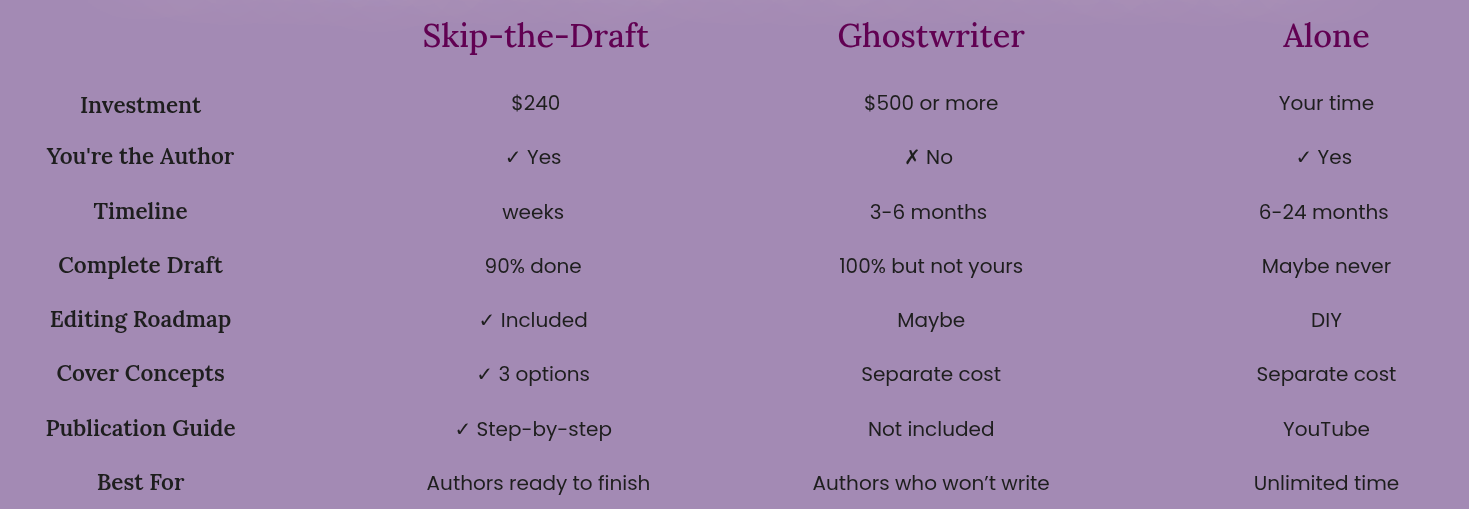 The Skip-the-Draft Package is a complete publishing assembly kit. You receive a structured folder containing every document you need to move directly into your final editing phase and launch.